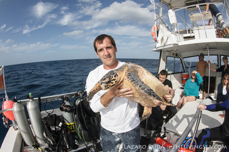 Back on the boat we headed just north to the Toy Box and Playpen area where we had seen a juvenile hawksbill sea turtle living in the wreck. Less than ten minutes after descending, we came across the little turtle and Larry Wood grabbed a hold of it and, along with Larry’s assistant, they slowly surfaced.