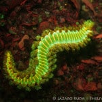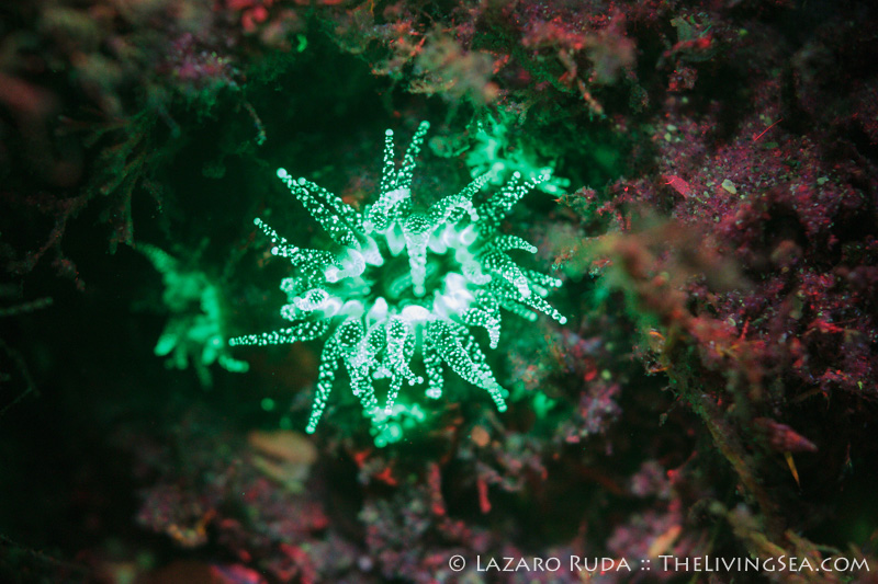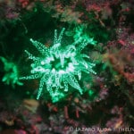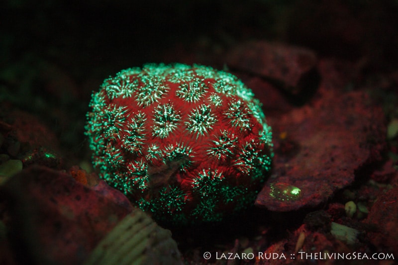 It was like a 1970’s psychedelic underwater black light party! The neon-glowing fluorescence of fireworms, octopus, corals, and tube anemones carpeted the ocean floor at the famous Blue Heron bridge. Thanks to the generosity of Light & Motion — creators of powerful and compact underwater lights — Pura Vida divers had the opportunity to try out the new Sola Nightsea fluorescent underwater light system.