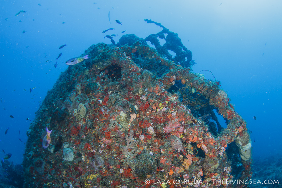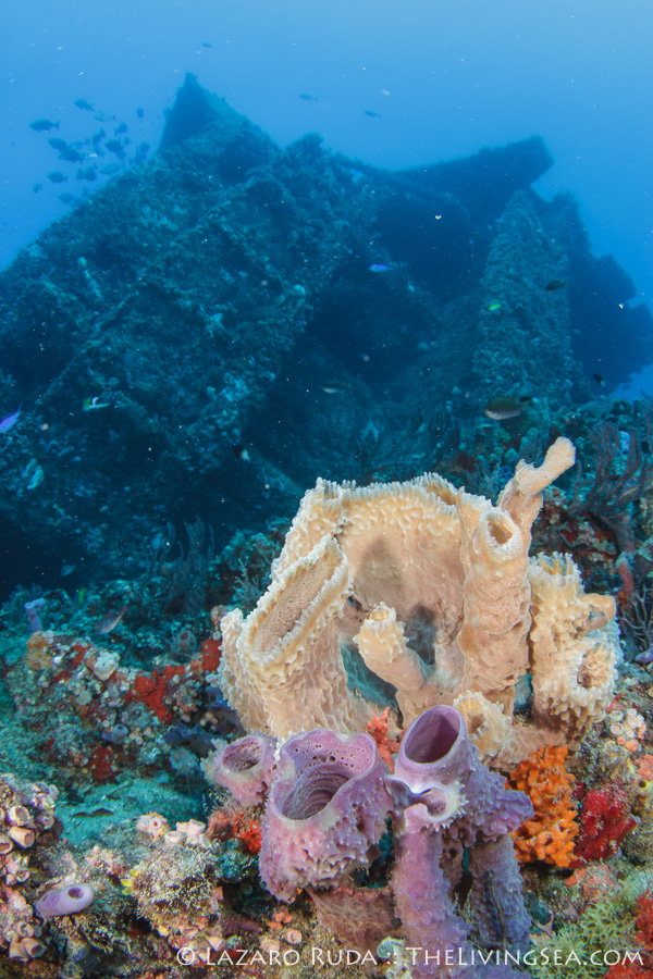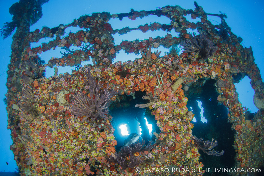 We were greeted by a bull shark upon our descent. The large school of creole wrasses and great barracudas engulfed the wrecks. A large school of jacks circled around like an underwater tornado. With the beautiful blue-water backdrop, the wreck’s stunning colors shined through.